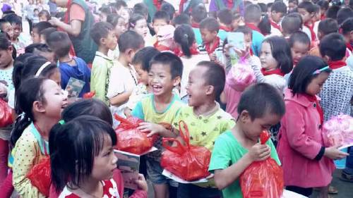 早晨7點(diǎn)鐘,愛心隊(duì)伍從南寧地王大廈出發(fā),途中路況極差,塵土飛舞。車隊(duì)歷經(jīng)九個(gè)小時(shí)到達(dá)泮水鄉(xiāng)村冊(cè)外小學(xué)。愛心團(tuán)隊(duì)的到來,頓時(shí)令這個(gè)校園學(xué)生歡騰熱鬧起來,學(xué)生排好整齊的隊(duì)伍歡迎著愛心隊(duì)伍的到來。學(xué)生代表們給到場(chǎng)的每一位愛心人士戴上了感恩紅巾。