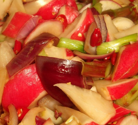 5)櫻桃蘿卜大一點(diǎn)的對半切開,生姜切片,芹菜切段。