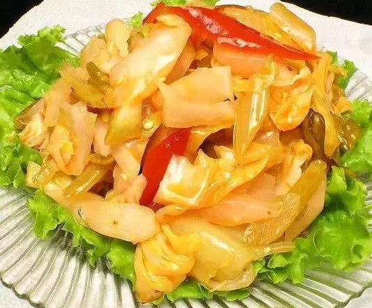 食材:卷心菜200g、鹽1湯匙、花椒生姜白糖1湯匙、白酒2湯匙、姜適量、青椒50g、紅尖椒10g